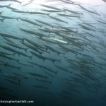 Two sea lions dived down from the surface, spinning and turning with incredible agility, zipping around us like underwater break-dancers as we approached a dark shadow in front of us. The other divers were ahead and, as I turned to take a snap, went in and disappeared. As I approached I saw that it was in fact a huge school of the endemic black-striped salema (Xenocys jessiae). Where were the others? I moved forward. The fish parted a little, but stayed inches from me. I went in some more and it got dark. I looked around and saw that they had surrounded me, I was engulfed in a giant amorphous blob of fish. I could hear the DM rattling his shaker, trying to guide me on. I tapped back on by strobe arm. I swam on and we met up, four divers in a zillion sardine-sized fish. Incredible. When we emerged back into daylight, more sea lions came to play briefly, then sped off, no doubt to get a stripy snack.