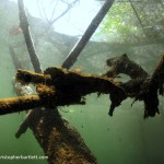 Julio’s prowess wasn’t limited to tricky boat manoeuvres either. At Elfinado he donned mask and fins and found two arches occupied by close to a dozen whitetips, and then led us to the mangroves to show us his secret seahorse. Tail wrapped around a branch, with the sunlight filtering through the film-covered surface the view was ethereal. Just below a turtle snoozed, half-under a ledge on a bed of leaves in an almost autumnal composition. To cap a great day, he pointed us to narrow, shallow channel close to the port and told us to snorkel carefully along the top. The incoming tide made the water murky, but a couple of metres below us we made out first one, then two, then another now-familiar whitetip. As we pulled ourselves along the sides of the 100-metre long one-metre wide channel, we could see that the bottom was carpeted with them. My notes say “Photography value zero, thrill value high”. On a slack tide with some viz, it would have been amazing.