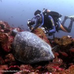Simon’s left arm shot out, index finger extended, and he clenched his right fist and stuck it on the side of his head. I scanned left and right fast, peering through my mask into the milky blue water. “Where?! Where?!” my brain implored. “There!!!” my eyes answered. “At last” I smiled to myself with relief, bringing by camera up to eye level as the school of scalloped hammerheads cruised past 10 metres away, swaying over the sandy bottom of the underwater caldera in the middle of the site called Gordon Rocks. I now knew that Gordon certainly did, providing me, and many other divers over the years, with their first sightings of this oddly but brilliantly-shaped fish.