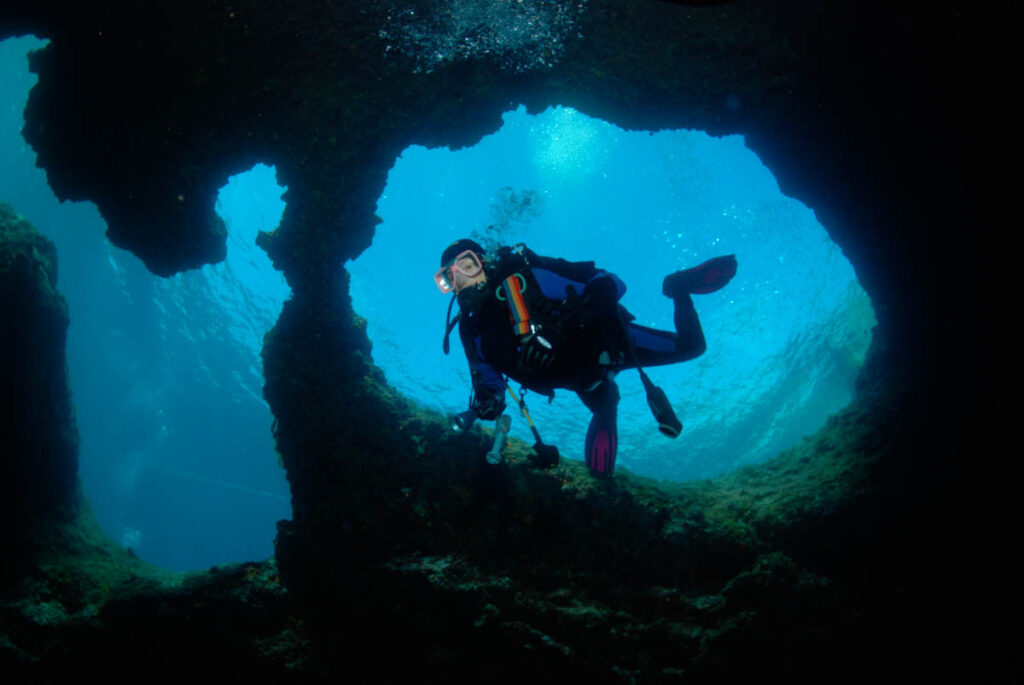 A cavern dive with dramatic light, sandy floor, and curious sea life—including amberjacks and hammer crabs. Easy entry at 3 m depth, descending to 42 m.
