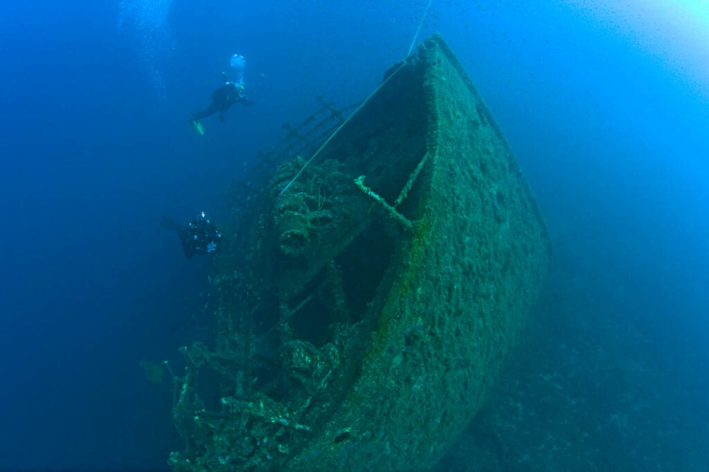 A dramatic wreck with a bow lodged at 25 m and stern at 50 m—this Italian steamer sank with military cargo in WWII. A cargo tractor still stands upright on the seabed.