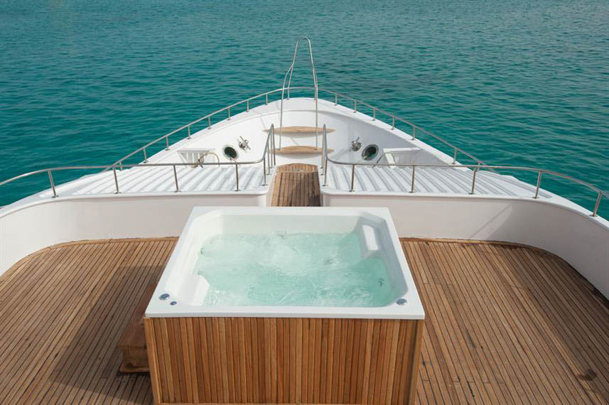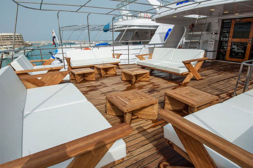 The social spaces are equally inviting. A bright dining salon serves hearty buffet meals and international favourites, while the upper deck lounge offers a comfortable retreat for briefings or post-dive relaxation. Out on the sundeck, cushioned loungers, shaded areas and a bubbling Jacuzzi invite divers to unwind between dives, often with a Red Sea sunset glowing on the horizon.