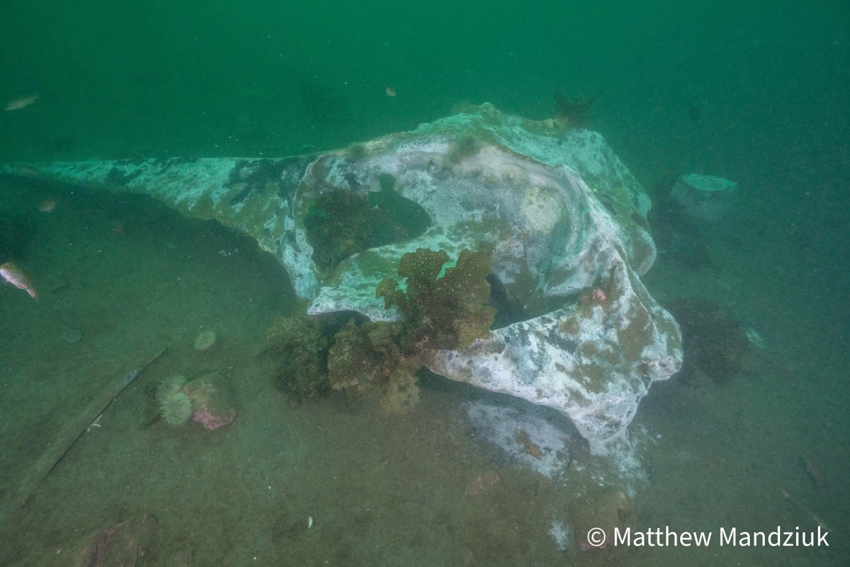 “Depth ranges are 40-65’. Water temperatures were 54 degrees Fahrenheit at depth in early September: it’s usually freezing cold when we dive it in July. We do a max of 60 minutes bottom time.
