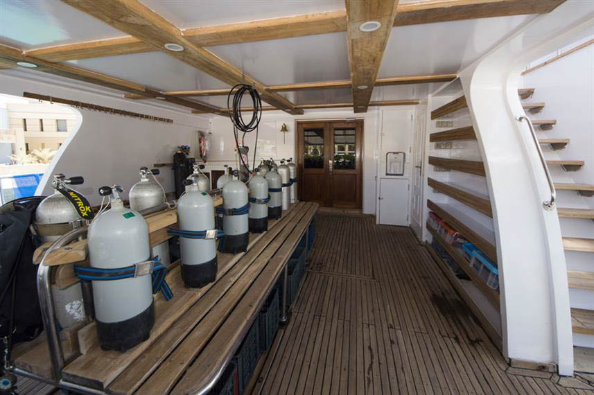 The dive deck is well organised with good bench space, fresh water rinse points and a stable platform that makes stepping off for a dive feel effortless. Photographers benefit from charging stations and storage, and certified guests receive free nitrox. According to the team at liveaboard.com, the boat scores consistently high marks for food and comfort which is always appreciated on long offshore routes.