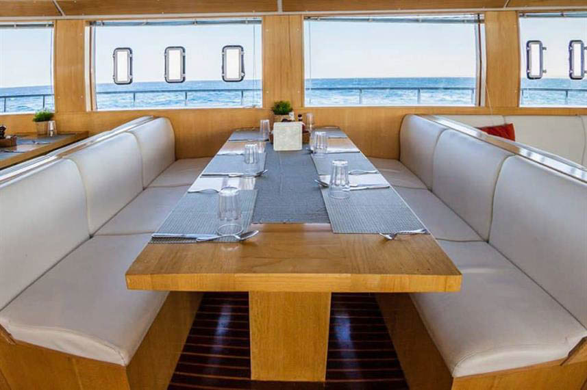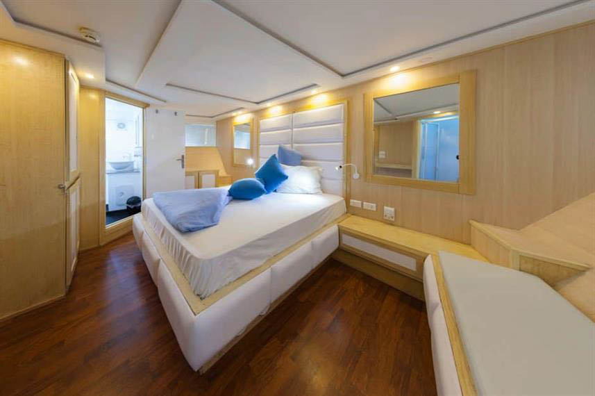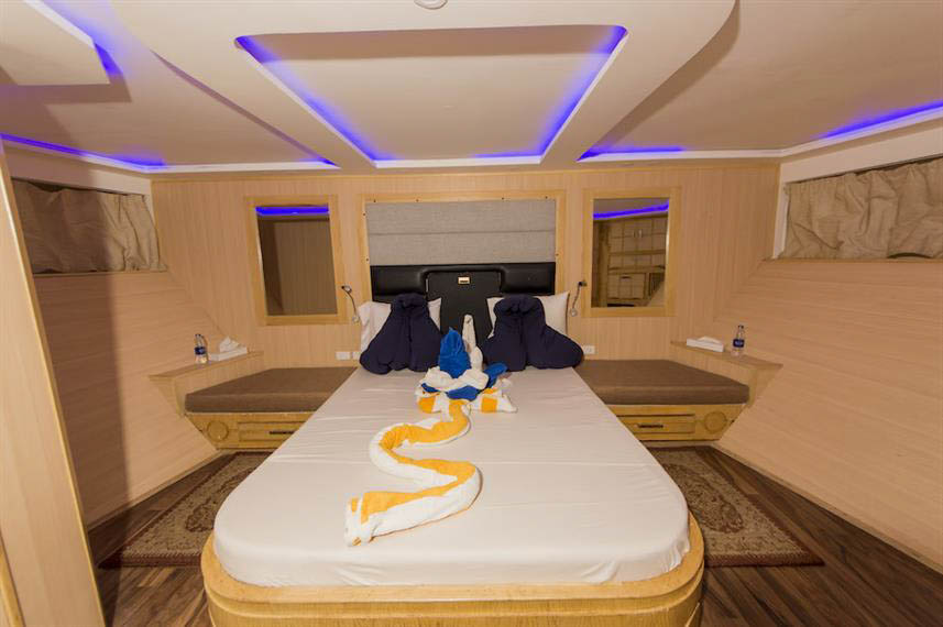 The boat accommodates twenty four guests in twelve en suite cabins with individually controlled air conditioning and comfortable beds that make the long days in the water easy to recover from. Some cabins sit on the upper deck for guests who prefer sea views while others on the lower deck provide a calmer ride during overnight sailings. Shared indoor areas include a bright salon and dining room with wide windows and a lounge layout designed for social groups and photographers reviewing footage. Outdoor shaded spaces give guests a place to unwind with a coffee between dives and the sundeck becomes a warm meeting point after sunset.