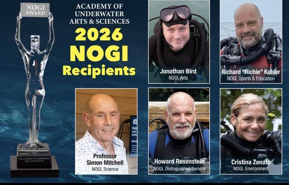 The Academy of Underwater Arts and Sciences (AUAS) has announced the 2026 recipients of the prestigious NOGI Award – Jonathan Bird (Arts), Dr. Simon Mitchell (Science), Cristina Zenato (Environment), Richard Kohler (Sports/Education) and Howard Rosenstein (Distinguished Service).