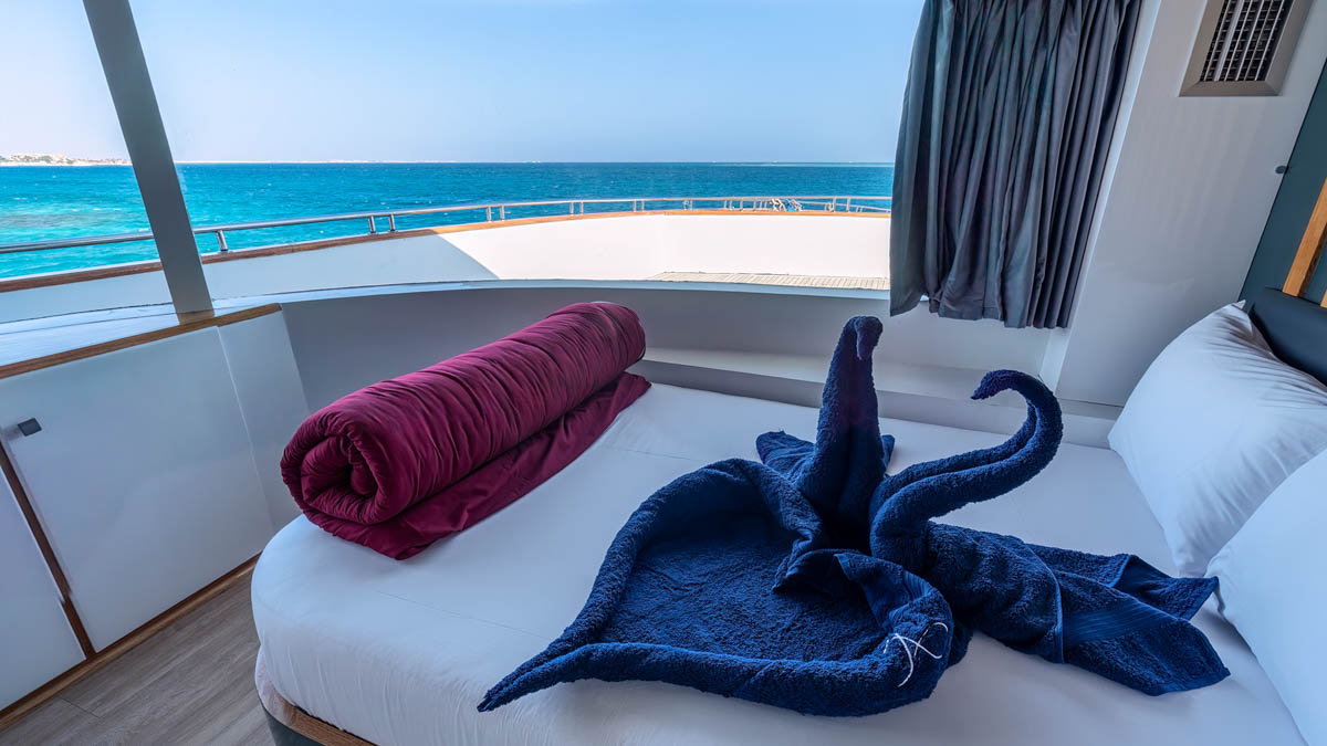 - A Standard of Excellence: Even the “standard” cabins on the main deck far exceed industry norms. Each room is a masterclass in contemporary design, featuring crisp individual climate control, ensuite bathrooms with high-pressure hot water, a stocked mini-bar, and premium linens. Some cabins even offer adjoining doors, making this one of the few luxury vessels truly optimized for families interested in Egypt liveaboard diving.